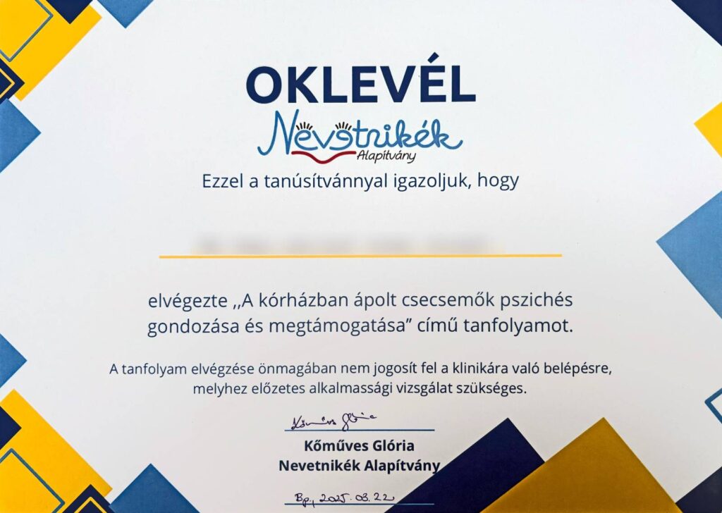 XY vagyok, debreceni lakos. Elvégeztem a Nevetnikék Alapítvány „A kórházban ápolt csecsemők pszichés gondozása és megtámogatása” című tanfolyamot. (Az oklevelet mellékelten csatolom.)