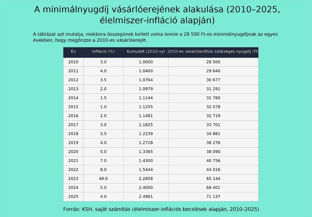 Ha a 2010-es vásárlóerőt szeretnénk megőrizni, a nyugdíjnak 71 ezer forintnak kellene lennie 2025-ben.